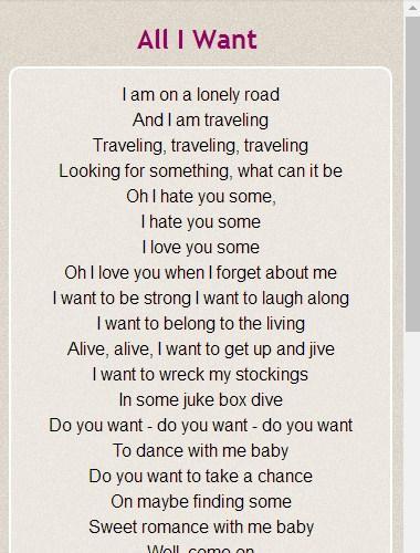 A journey into joni mitchell's artistry is one of a highly original, harmonically innovative, and emotionally charged, familiar yet fresh adventure. D7 em really want our love to do, f c d7 is to bring out the best in me, g and in you too. Gd7em all i really, really want our love to do, fcd7gis to bring out the best in me, and in you. Crd all i want/joni mitch all i want joni mitchell (c) 1971 d a7 bm i am on a lonely road and i am traveling c g c a7 d looking for something, what can it be? I am on a lonely road and i am traveling traveling, traveling, traveling looking for something, what can it be?